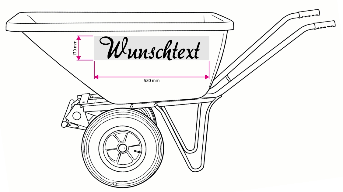 - Einsatzbereich: Eine Schubkarre ist ein Arbeitsgerät. Trotz hoher Qualität der Folierung können mechanische Belastungen (z. B. scharfkantiger Bauschutt, Steine oder chemische Lösungsmittel) zu Kratzern oder Beschädigungen der Personalisierung führen. Dies stellt keinen Reklamationsgrund dar.
